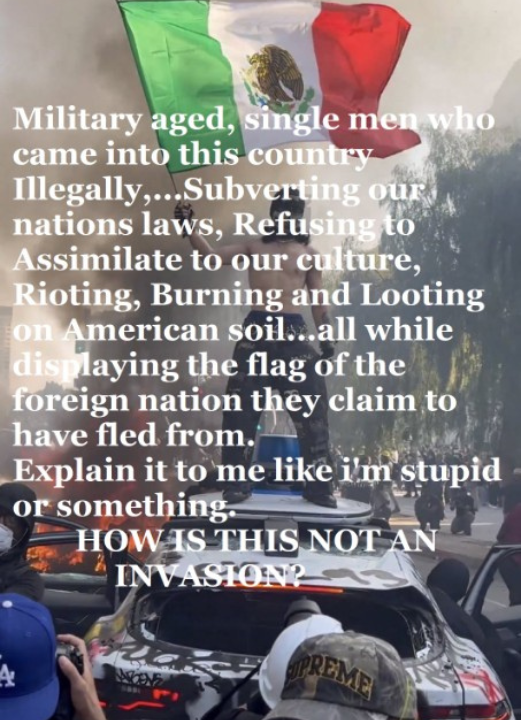 This meme features an image of chaos—burning cars, a man standing on a vehicle, and a massive Mexican flag in the background. Overlaid is text accusing “military-aged, single men” of invading the country, refusing to assimilate, and rioting—topped off with “EXPLAIN IT TO ME LIKE I’M STUPID” and the demand, “HOW IS THIS NOT AN INVASION?”
