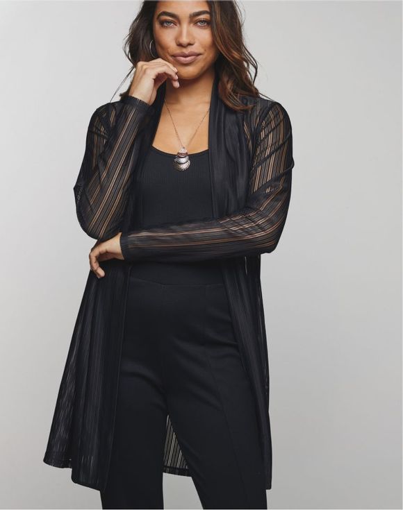 I also grabbed the Burnout Cardigan. It’s lightweight, wrinkle-resistant, and has that “day to night” versatility. I could wear it to work or save it for an evening out. The sheer, subtly striped fabric drapes beautifully, giving it a touch of elegance without feeling fussy.